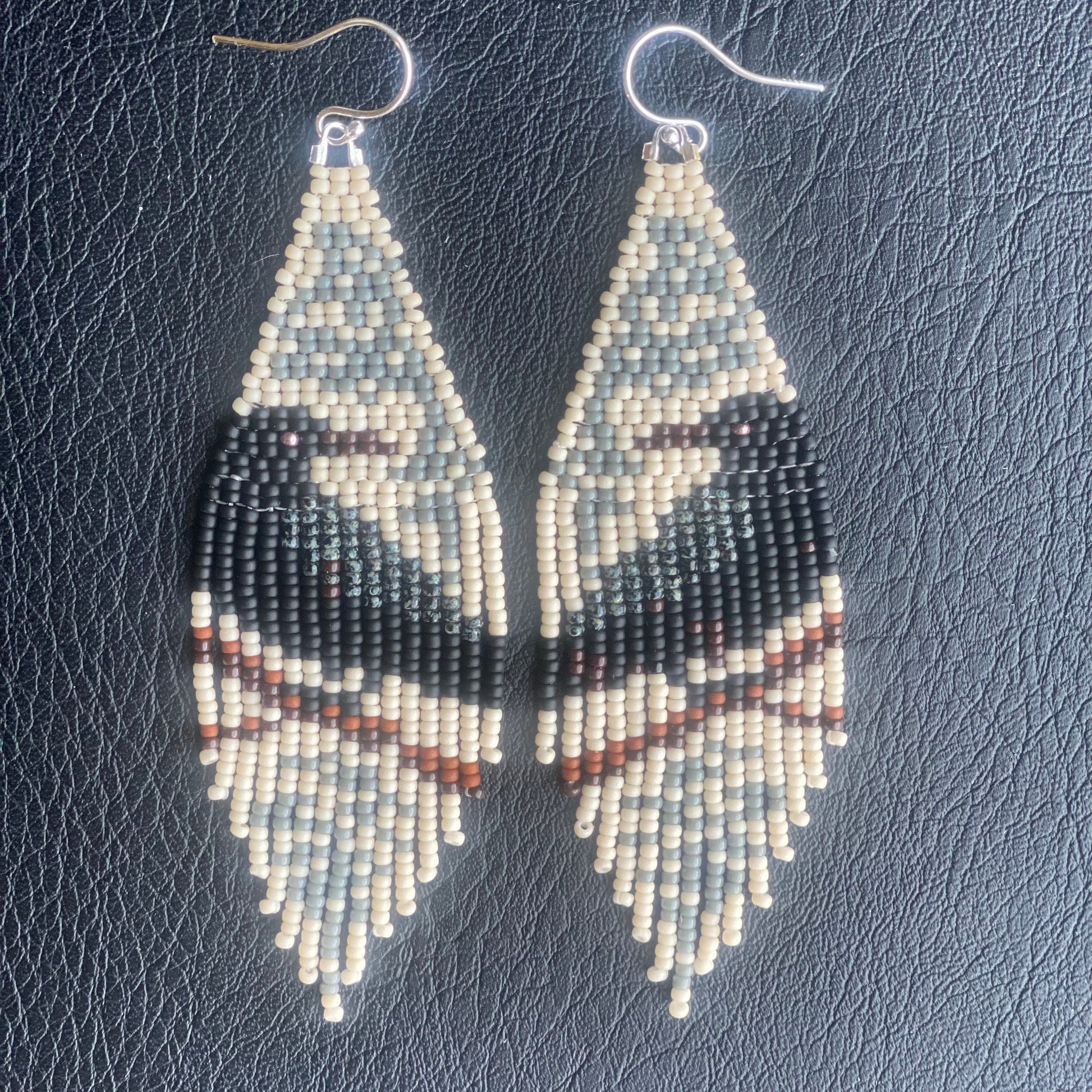 Black Raven sitting on brown tree branch with gray background beaded fringe earrings